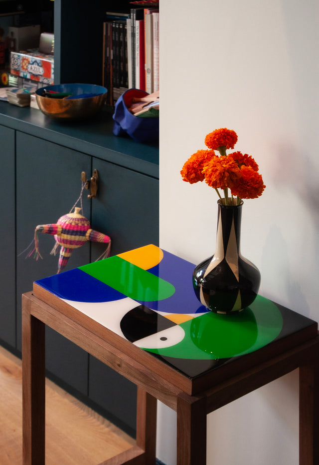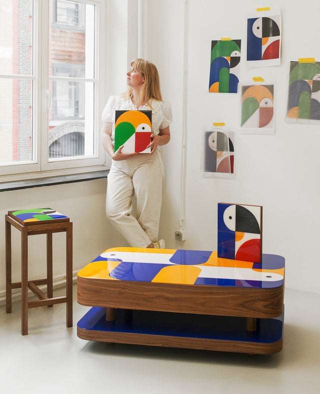 Malika's geometric birds transform into a playful display on Alice's double-sided furniture. Painted on both faces, the objects gracefully meld into the surrounding space. Their vibrant, intense hues are enhanced by a layer of resin, lending them a distinct gleam that contrasts with the wood's matte texture.
